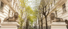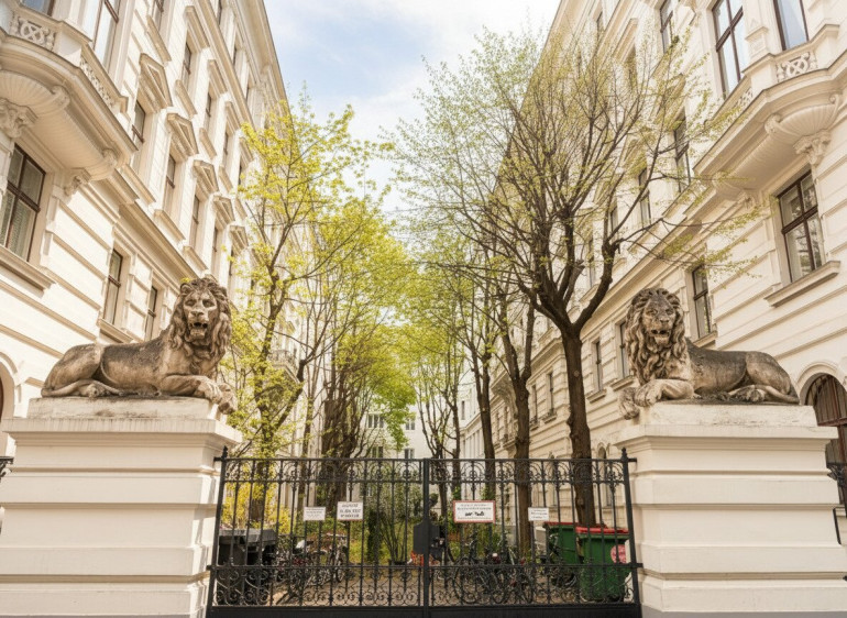 Bereits beim ersten Betreten der Liegenschaft eröffnet sich ein besonderes Wohngefühl: Der eindrucksvolle, repräsentative Haupteingang, flankiert von markanten Löwenskulpturen, führt in einen liebevoll begrünten Innenhof, der Ruhe, Eleganz und ein Gefühl von Exklusivität vermittelt.