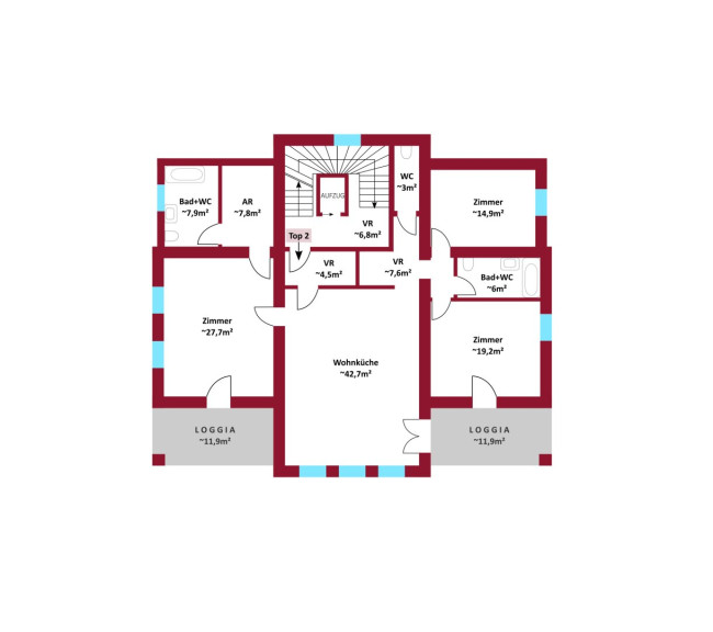 - Zwei Loggien (je ca. 12 m²) : Diese sind direkt von den Schlafzimmern und dem Wohnzimmer aus begehbar. Mit süd-westlicher Ausrichtung genießen Sie die Abendsonne.