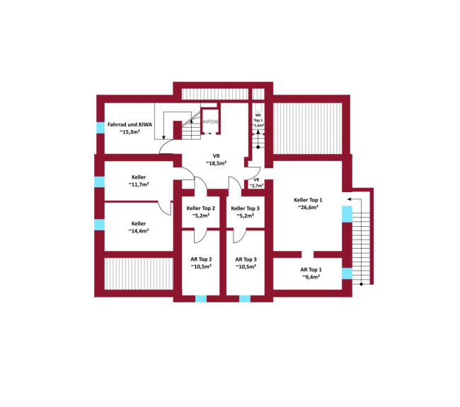 Zu jeder Wohneinheit gehört ein eigenes Kellerabteil. Darüber hinaus stehen ein gemeinsamer Kinderwagenraum, ein Fahrradabstellplatz sowie ein Weinkeller allen drei Einheiten zur Verfügung.