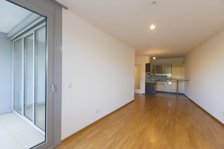 Wohnzimmer mit offener Küche und Zugang zur Loggia/Balkon, Schlafzimmer mit Zugang zur Loggia/Balkon, Vorzimmer,