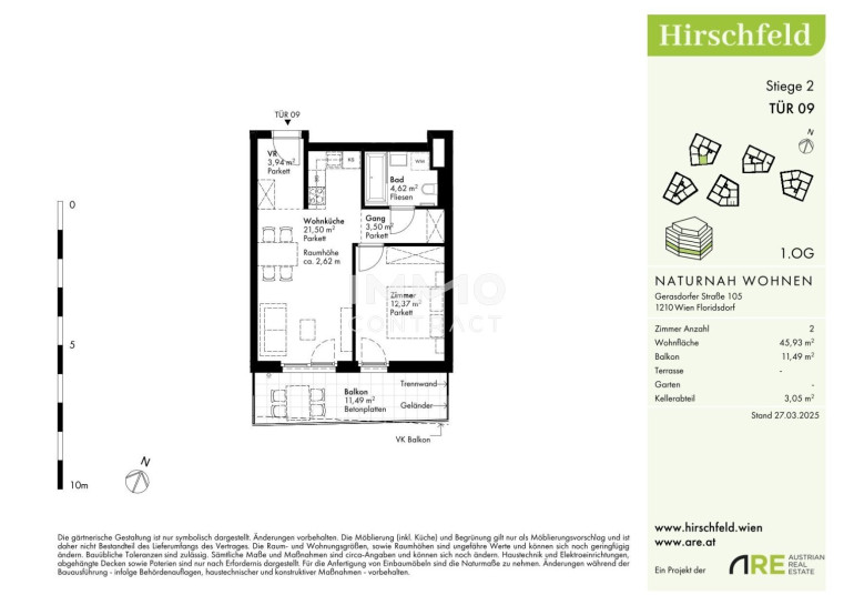 Naturnah und gut angebunden Hirschfeld ist ein beschauliches Viertel am Wiener Stadtrand. Die Metropole im Rücken verheißt jedem Nachhausekommen ein Naturerlebnis und Entspannung. Wer gerne mit den Wiener Linien unterwegs ist, nimmt am besten die Autobuslinie 32A ab Kollarzgasse bis zum U- und S-Bahn-Knotenpunkt Leopoldau. Von hier aus ermöglichen die U1 in Richtung Zentrum sowie die Schnellbahnlinien S1, S2 und S7 eine rasche Verbindung stadtein- und stadtauswärts. Alternativ verläuft die Straßenbahnlinie 31 entlang der Brünner Straße über Floridsdorf direkt bis Schottenring. Autofahrer profitieren von der nahegelegenen A22.
