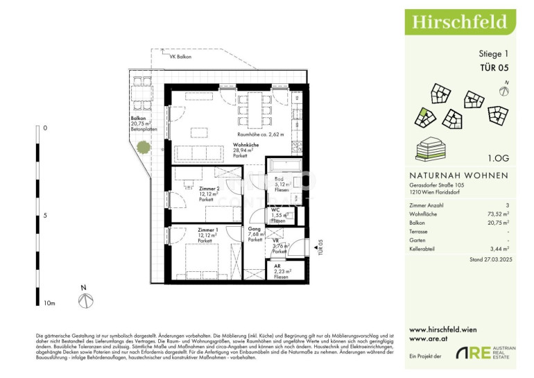 Naturnah und gut angebunden Hirschfeld ist ein beschauliches Viertel am Wiener Stadtrand. Die Metropole im Rücken verheißt jedem Nachhausekommen ein Naturerlebnis und Entspannung. Wer gerne mit den Wiener Linien unterwegs ist, nimmt am besten die Autobuslinie 32A ab Kollarzgasse bis zum U- und S-Bahn-Knotenpunkt Leopoldau. Von hier aus ermöglichen die U1 in Richtung Zentrum sowie die Schnellbahnlinien S1, S2 und S7 eine rasche Verbindung stadtein- und stadtauswärts. Alternativ verläuft die Straßenbahnlinie 31 entlang der Brünner Straße über Floridsdorf direkt bis Schottenring. Autofahrer profitieren von der nahegelegenen A22.