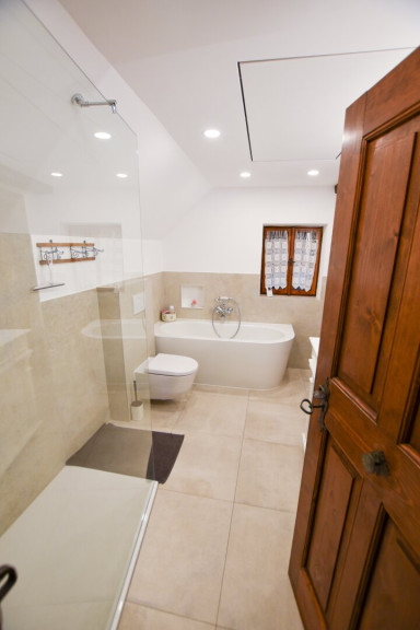 Die Beheizung erfolgt mit Kachelofen bzw. Stromheizung.