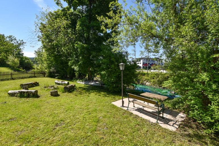 Auf dem insgesamt ca. 1.200 m² großen Grundstück finden sich etliche lauschige Plätzchen und „Sonnenbankerl“ zum Seele baumeln lassen. Auch die sonnige Terrasse und ein windgeschützter Sitzbereich laden zu entspannten Stunden im Freien ein. Highlight: Der direkte Zugang zur Fuschler Ache, die am Grundstück vorbeiplätschert – eine erfrischende Abkühlung an heißen Sommertagen!
