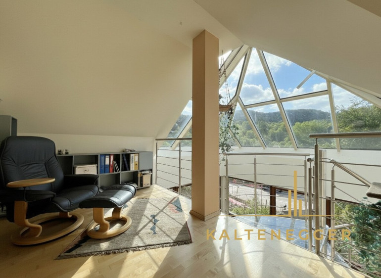 Derzeit präsentiert sich diese Ebene mit einer offen gestalteten, rund 52 m² großen Hauptfläche, die viel Raum für individuelle Konzepte bietet. Ergänzt wird sie durch ein weiteres Zimmer mit ca. 23 m², ausgestattet mit einem zusätzlichen Schwedenofen, der eine besonders behagliche Atmosphäre schafft. Von diesem Raum aus gelangen Sie auf eine rund 7 m² große Galerie. Über die dort befindliche Wendeltreppe ist das 2. Obergeschoss direkt mit dem Wintergarten im 1. Obergeschoss verbunden – eine architektonisch interessante und zugleich praktische Verbindung der Ebenen.