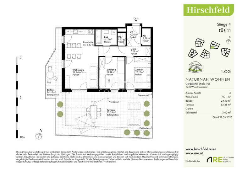 Willkommen im Hirschfeld – Leben im Grünen, nördlich der DonauAm Rande eines weitläufigen Grünzugs, der sich bis zum Bisamberg erstreckt, entsteht im naturnahen Hirschfeld ein einzigartiges Wohnquartier: Auf drei Bauplätzen entwickelt sich ein modernes Architektur-Ensemble mit elf Gebäuden und rund 440 Wohnungen – ideal für alle, die Ruhe im Grünen mit urbaner Lebensqualität verbinden möchten.
