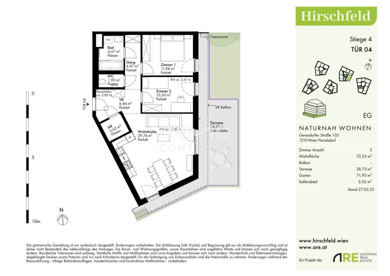 Naturnah und gut angebunden Hirschfeld ist ein beschauliches Viertel am Wiener Stadtrand. Die Metropole im Rücken verheißt jedem Nachhausekommen ein Naturerlebnis und Entspannung. Wer gerne mit den Wiener Linien unterwegs ist, nimmt am besten die Autobuslinie 32A ab Kollarzgasse bis zum U- und S-Bahn-Knotenpunkt Leopoldau. Von hier aus ermöglichen die U1 in Richtung Zentrum sowie die Schnellbahnlinien S1, S2 und S7 eine rasche Verbindung stadtein- und stadtauswärts. Alternativ verläuft die Straßenbahnlinie 31 entlang der Brünner Straße über Floridsdorf direkt bis Schottenring. Autofahrer profitieren von der nahegelegenen A22.