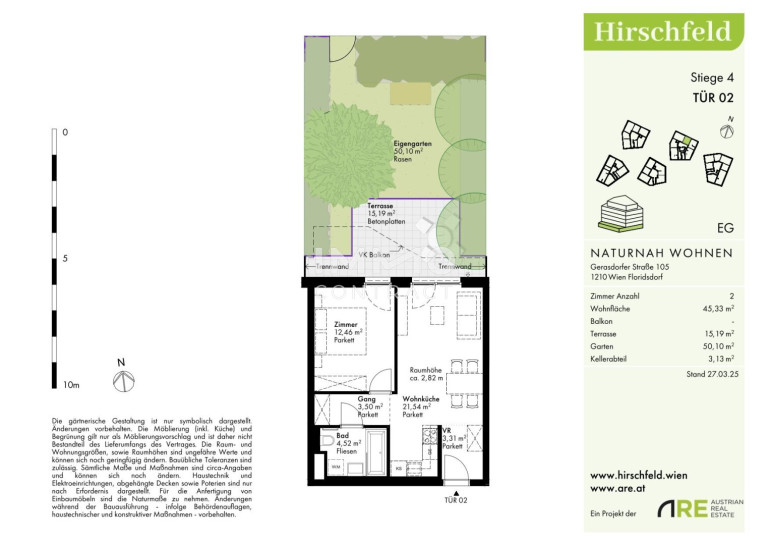 Naturnah und gut angebunden Hirschfeld ist ein beschauliches Viertel am Wiener Stadtrand. Die Metropole im Rücken verheißt jedem Nachhausekommen ein Naturerlebnis und Entspannung. Wer gerne mit den Wiener Linien unterwegs ist, nimmt am besten die Autobuslinie 32A ab Kollarzgasse bis zum U- und S-Bahn-Knotenpunkt Leopoldau. Von hier aus ermöglichen die U1 in Richtung Zentrum sowie die Schnellbahnlinien S1, S2 und S7 eine rasche Verbindung stadtein- und stadtauswärts. Alternativ verläuft die Straßenbahnlinie 31 entlang der Brünner Straße über Floridsdorf direkt bis Schottenring. Autofahrer profitieren von der nahegelegenen A22.