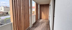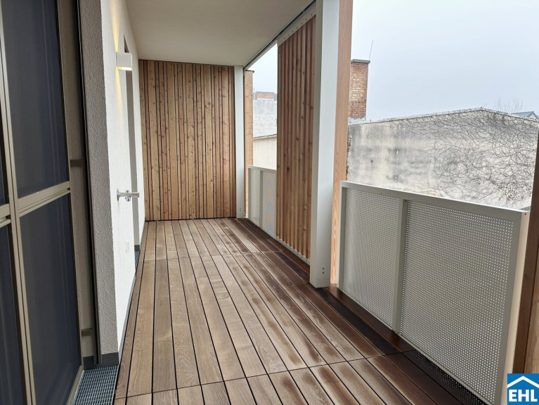 Große Fenster sorgen hier für viel Tageslicht und eine angenehme Wohnatmosphäre. Der Raum bietet ausreichend Platz für die Küche sowie einen gemütlichen Wohnbereich. Von hier aus betreten Sie auch den Balkon, der mit Holzbelag und seitlichen Holzelementen einen ruhigen Außenbereich schafft. Das Schlafzimmer ist separat begehbar und gut dimensioniert – ideal für Bett und Kleiderschrank.
