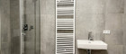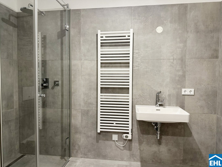 Auch hier sorgt das große Fenster für Helligkeit. Das Badezimmer ist modern ausgestattet und verfügt über eine Dusche, ein Waschbecken sowie einen Handtuchheizkörper. Die schlichte, zeitgemäße Gestaltung rundet das Gesamtbild ab. In allen Wohnräumen ist ein hochwertiger Holzboden verlegt, ergänzt durch eine angenehme Fußbodenheizung.
