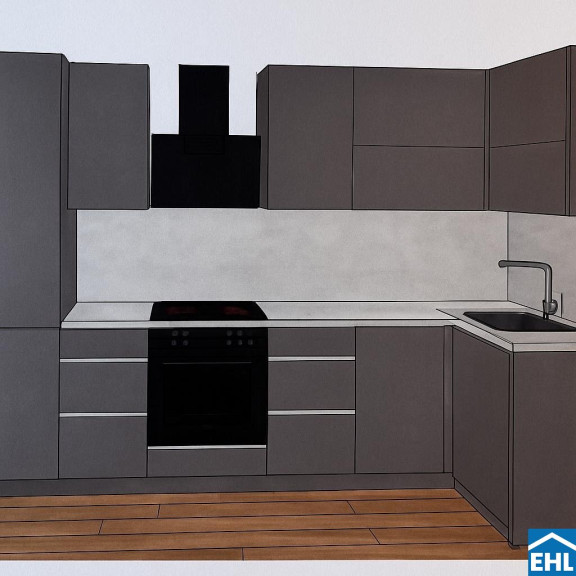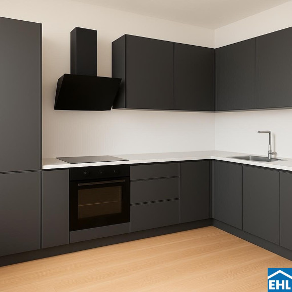 Die Küche wird bei der Vermietung bereits eingebaut sein! Bitte beachten Sie, dass das beigefügte Bild eine KI-Visualisierung ist.