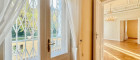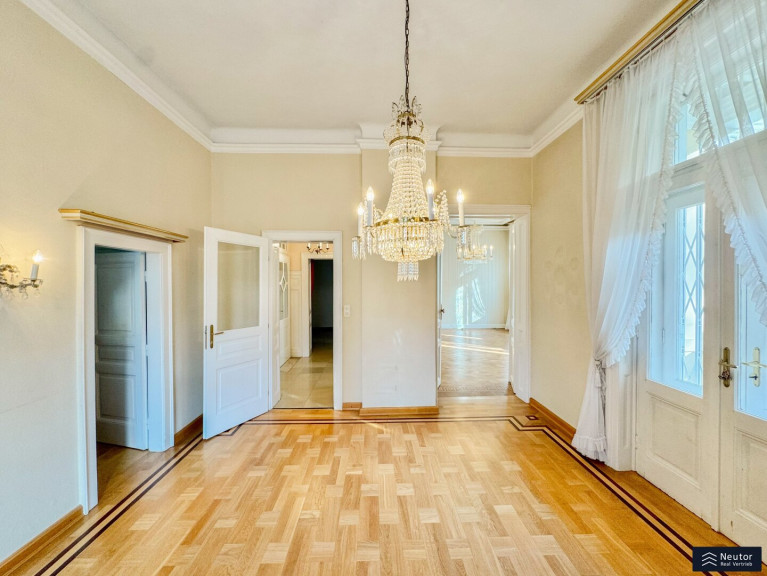 Edler Echtholzparkett zieht sich durch die gesamte Belle Etage. Hohe Doppelflügeltüren eröffnen spannende Blickachsen und verleihen den Räumen ein herrschaftliches Flair. Das Herzstück bildet der zentral gelegene Wohnsalon mit angrenzendem Speisezimmer und Bibliothek, von denen die beiden bezaubernden Loggien den Blick ins Grüne freigeben.