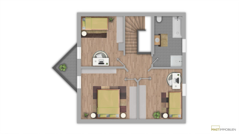 Im Obergeschoss befinden sich 3 Schlafzimmer und ein Badezimmer mit Badewanne und Dusche. Der Balkon mit westlichen Ausblick ist von 2 Schlafzimmer aus begehbar.