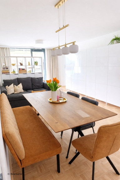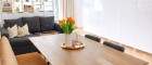 Das Wohnzimmer wird, wie die offene Küche, durch große Glaselemente mit viel natürlichem Licht versorgt.