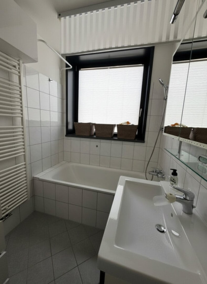 Im Vollverfliesten Bad finden Sie neben Waschbecken, Badewanne und Handtuchtrocker auch einen Waschmaschinenanschluss.
