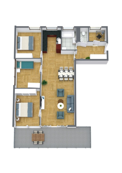 Vom Wohnzimmer aus sind drei Schlaf-, Kinder- bzw. Arbeitszimmer und der ca. 14m² große Balkon begehbar.