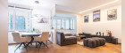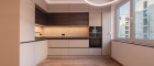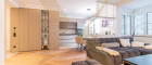 Der edle Fischgrät-Parkettboden verleiht dem Wohnraum zeitlose Eleganz. Die maßgefertigte Einbauküche mit hochwertigen Markengeräten fügt sich nahtlos in das stilvolle Gesamtbild ein. Raffinierte Details wie integrierte Vitrinenelemente und flächenbündige Fronten unterstreichen den exklusiven Anspruch. Teilweise vorhandene elektrische Raffstores bieten zusätzlichen Komfort und Privatsphäre.