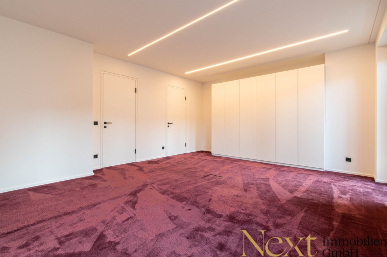 Das Herzstück bildet der beeindruckende, offen gestaltete Wohn- und Essbereich mit integrierter Designküche. Großzügige Fensterflächen, ein markanter Erker sowie eine durchdachte Lichtplanung mit indirekter LED-Beleuchtung schaffen ein lichtdurchflutetes, stimmungsvolles Ambiente. Eine architektonisch gestaltete Akustikdecke sorgt nicht nur für ein optisches Highlight, sondern auch für ein angenehmes Raumgefühl.