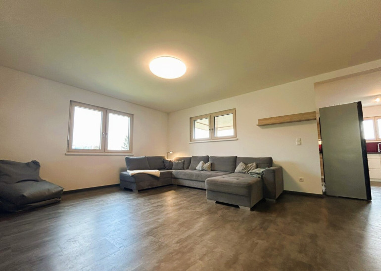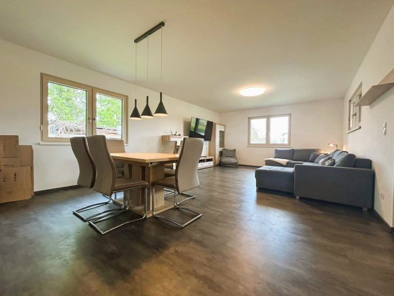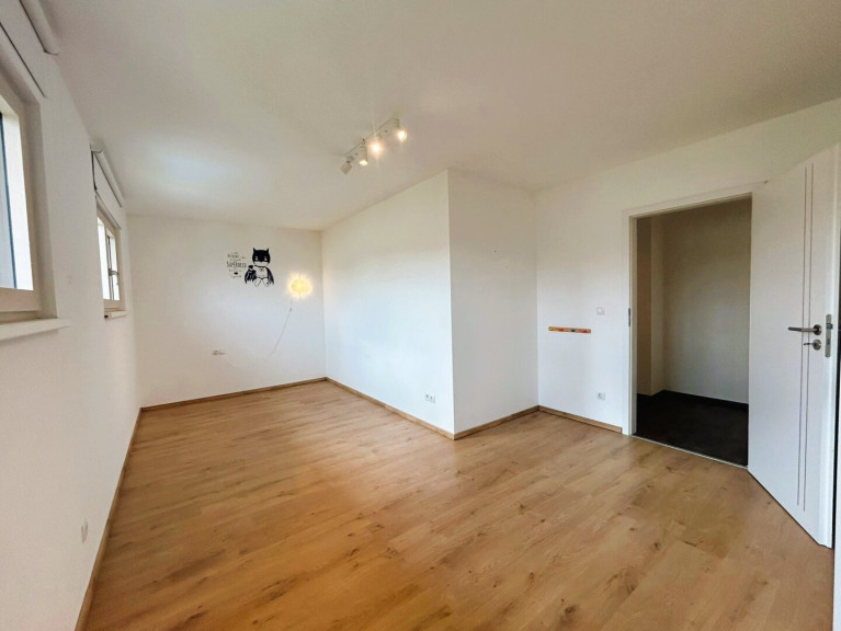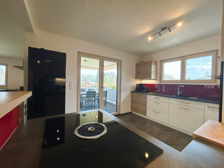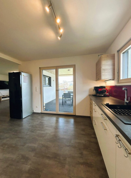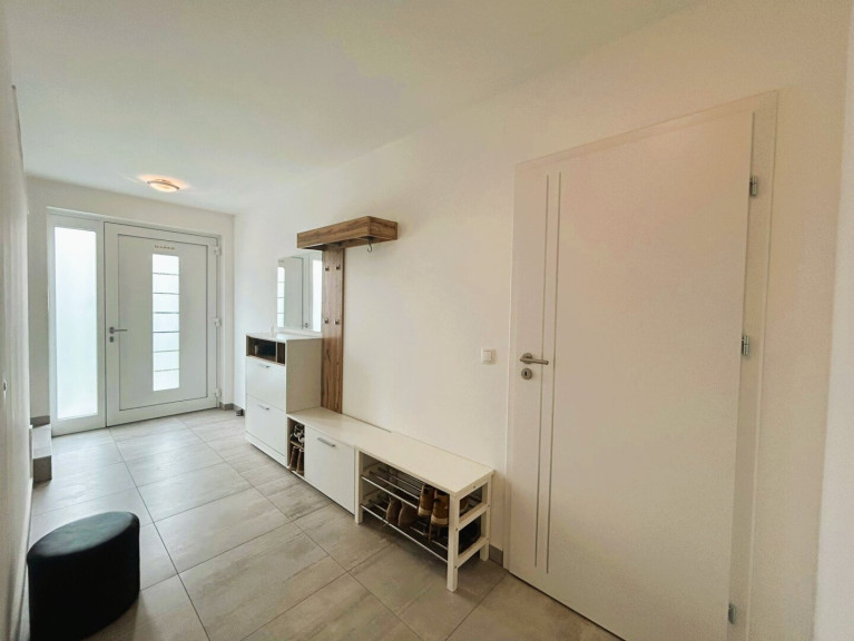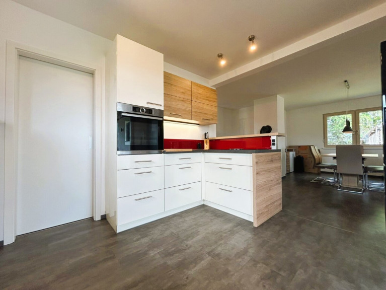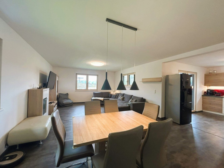 Bereits beim Betreten des Hauses wird der moderne und offene Wohncharakter spürbar. Das Herzstück bildet die großzügige, offene Küche, die nahtlos in den Wohn- und Essbereich übergeht. Große Fensterflächen mit Mehrfachverglasung und Raffstores sorgen für lichtdurchflutete Räume und ein angenehmes Wohnklima zu jeder Jahreszeit.