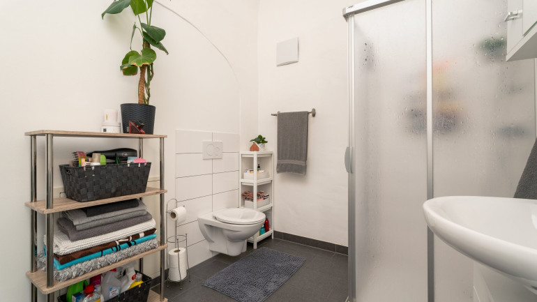 Diese Wohnung ist klein aber fein - sie bietet 1 Zimmer, in welchem sich Wohnen, Schlafen und Essen vereinen lassen, das Badezimmer ist tiefer gelegen und über ein paar Stufen begehbar. Dieses ist mit Dusche, Handwaschbecken und Waschmaschinenanschluss ausgestattet.