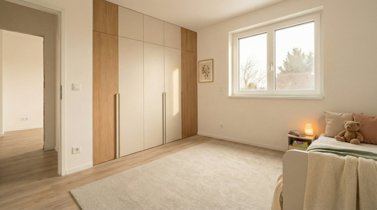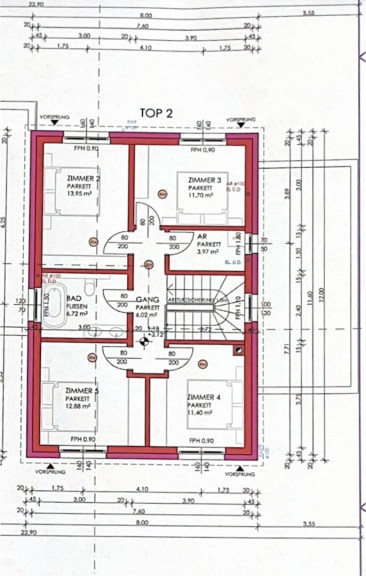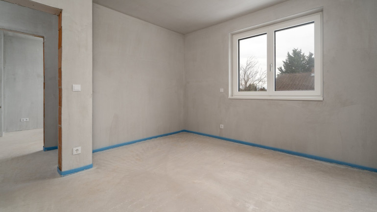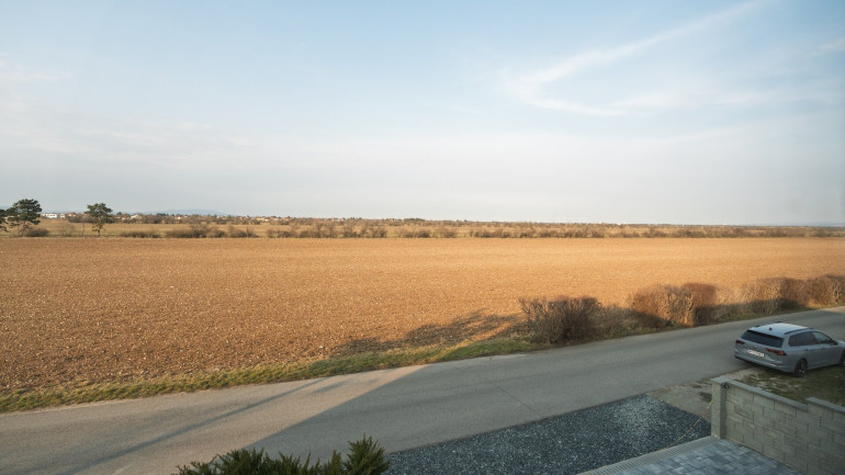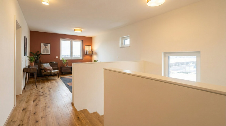 Im Obergeschoß befinden sich 3 Zimmer, welche sich ideal in Schlafzimmer, Kinderzimmer und Gästezimmer/Home-Office einteilen lassen. Alle Zimmersind zentral begehbar, zusätzlich sorgt der offene Wohnbereich für ein freies Wohngefühl. Zwei der Zimmer genießen einen Weitblick auf das Feld, der die Ruhe direkt ins Zuhause holt. Das Badezimmer im Obergeschoß istmit Wanne, Doppelhandwaschbecken und Waschmaschinenanschluss ausgestattet.