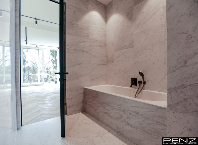 - Materialität in Perfektion: Edler Carrara-Marmor in den Bädern, feinstes Echtholzparkett und Design-Armaturen setzen luxuriöse Akzente.