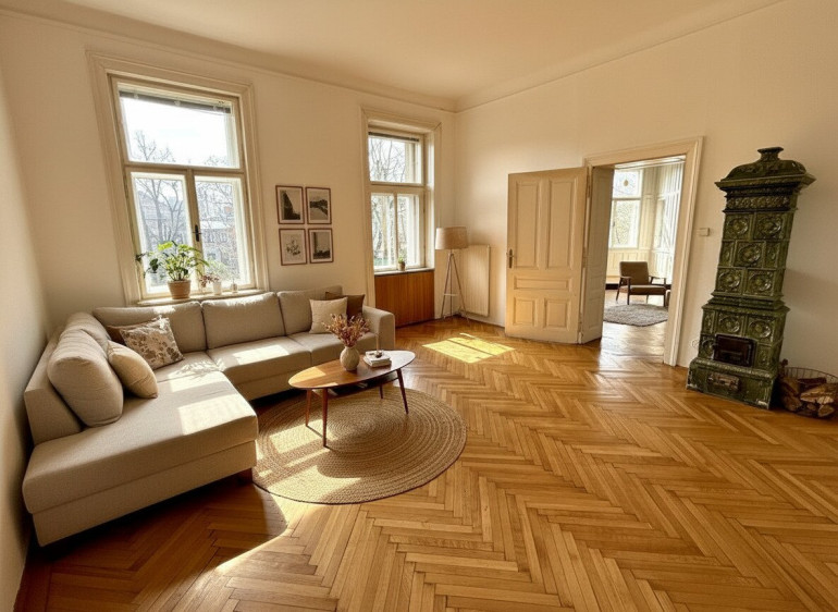 Die Wohnung überzeugt durch zahlreiche klassische Altbauelemente wie hohe Räume, stilvolle Flügeltüren, Fischgrätparkett sowie einen charakteristischen Kachelofen, die den besonderen Charme dieser Immobilie unterstreichen.