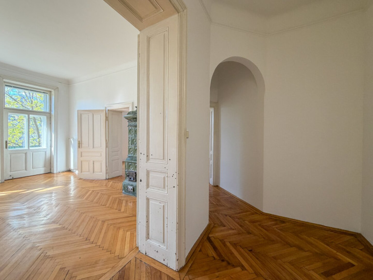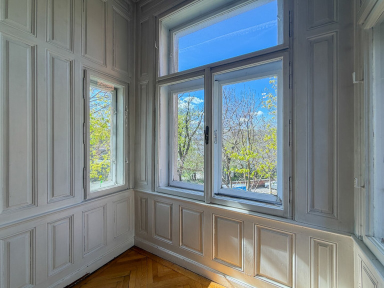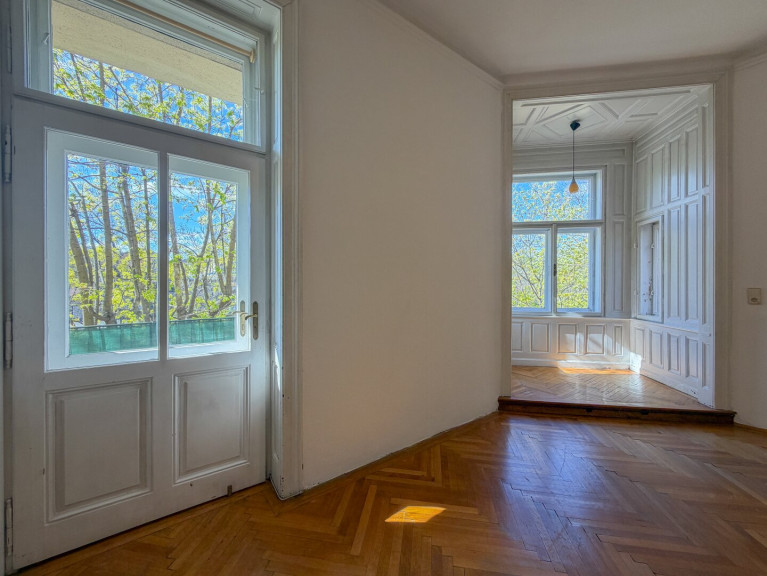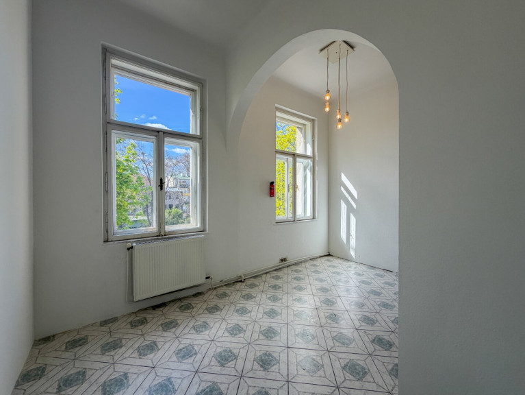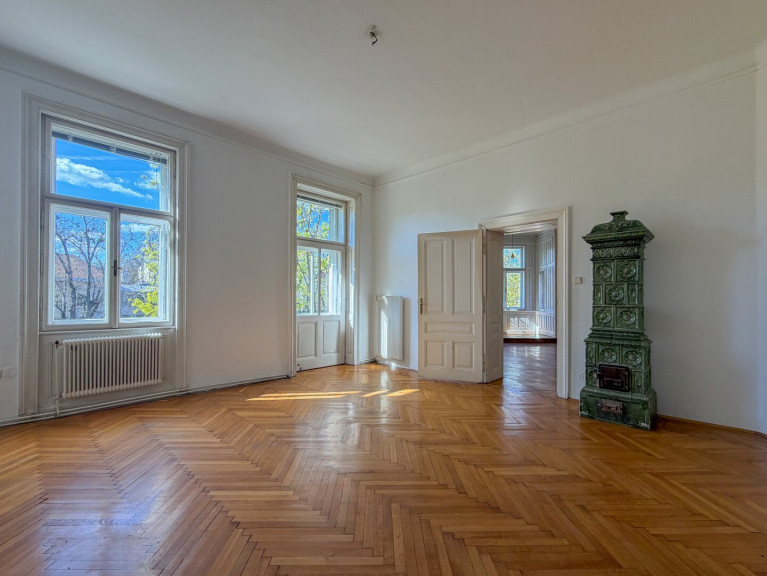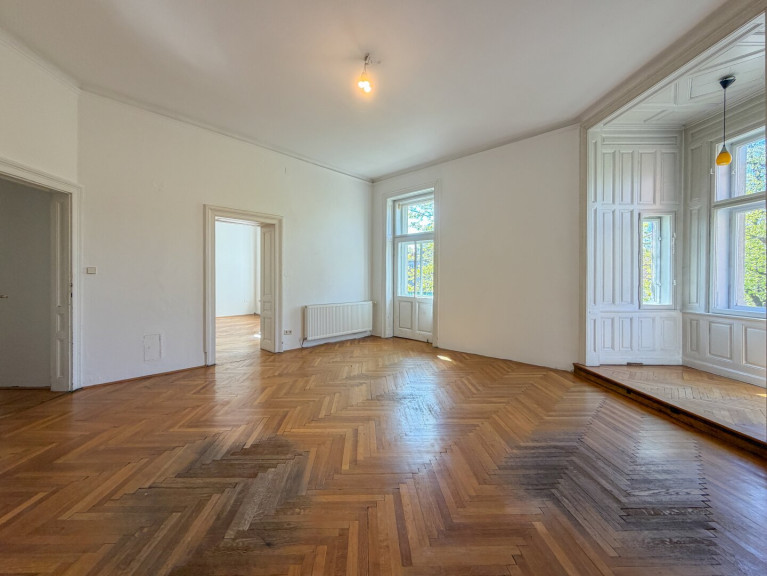 Die renovierungsbedürftige Wohnung erstreckt sich über ca. 92 m² und bietet drei großzügige, gut geschnittene Zimmer. Über das zentrale Vorzimmer gelangt man in die lichtdurchfluteten Wohnräume, darunter ein besonders charmantes Erkerzimmer.