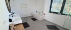 Kunststoffboden, Parkett, Fußbodenheizung, Wohnküche / offene Küche, Bad mit Fenster, Badewanne, Dusche, Garage, Swimmingpool