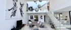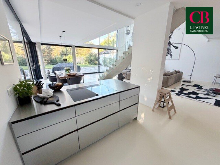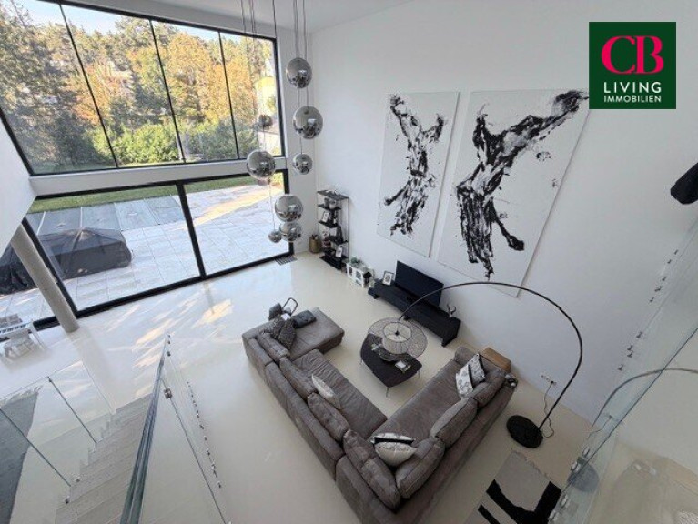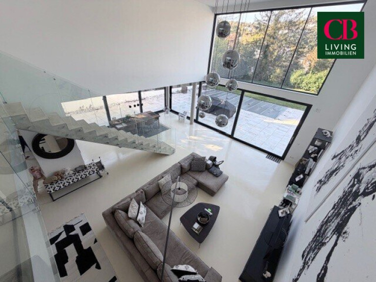 Der großzügige Wohnbereich beeindruckt mit seiner Weite und der spektakulären Fensterfront über zwei Etagen. Licht durchflutet jeden Winkel.