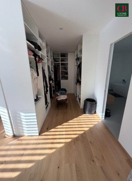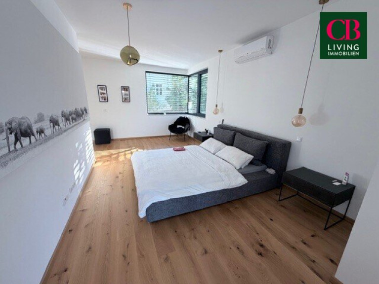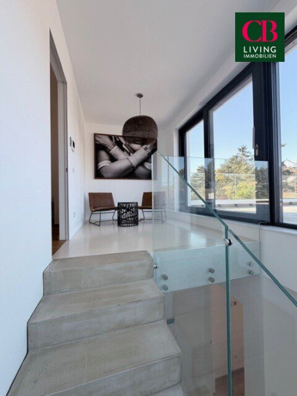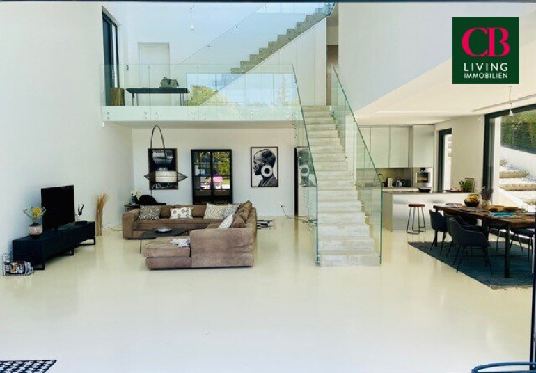Bereits beim Betreten eröffnet sich ein spektakulärer Wohnraum mit doppelter Raumhöhe, Galerieebene und imposanter Glasfront. Die offene Gestaltung schafft ein einzigartiges Wohngefühl aus Transparenz, Freiheit und Design.