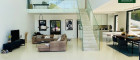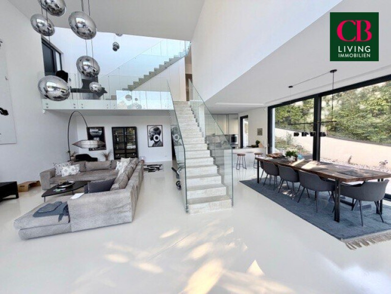 Der großzügige Wohnbereich beeindruckt mit seiner Weite und der spektakulären Fensterfront über zwei Etagen. Licht durchflutet jeden Winkel.