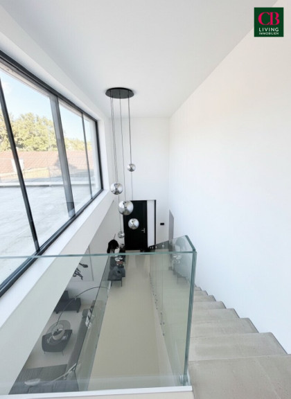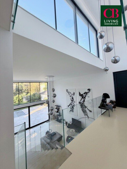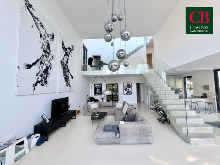 Bereits beim Betreten eröffnet sich ein spektakulärer Wohnraum mit doppelter Raumhöhe, Galerieebene und imposanter Glasfront. Die offene Gestaltung schafft ein einzigartiges Wohngefühl aus Transparenz, Freiheit und Design.