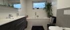 - Badezimmer mit Badewanne, WC und Fenster.