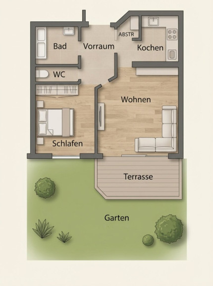 Der Wohnung zugehörig ist eine Gartenfläche mit ca. 40 m², ein Kellerabteil mit ca. 6 m² und ein Außenabstellplatz für PKWs.