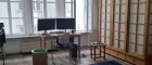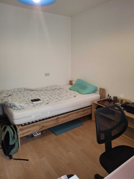 Nach rechts geht's zur zweiten Wohnung, zuerst in einen Vorraum, dann in eine kleine Küche, die verbaut und voll ausgestattet ist. Der nächste Raum ist das Wohnzimmer mit einer durchgängigen Fensterfront . Diesen Bereich würde ich als einen klassischen Altbau-Raum bezeichnen: groß, hell und mit sehr viel Charme. Weiter geht es in einen kleinen Durchgangsraum, der aktuell als Büro Verwendung findet, zu einem schönen Schlafzimmer.