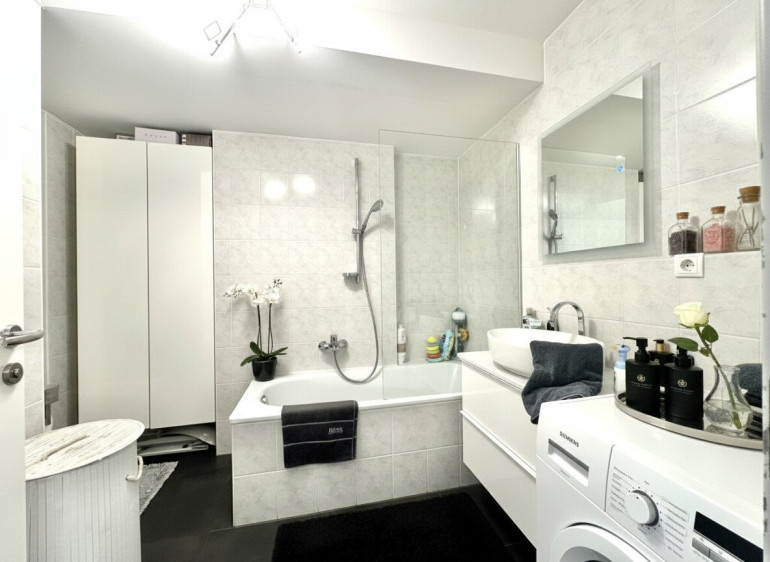 Das stilvolle Badezimmer verfügt über eine Badewanne, WC, Waschmaschinenanschluss sowie praktische Einbauschränke und rundet das Raumangebot optimal ab.
