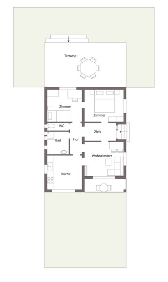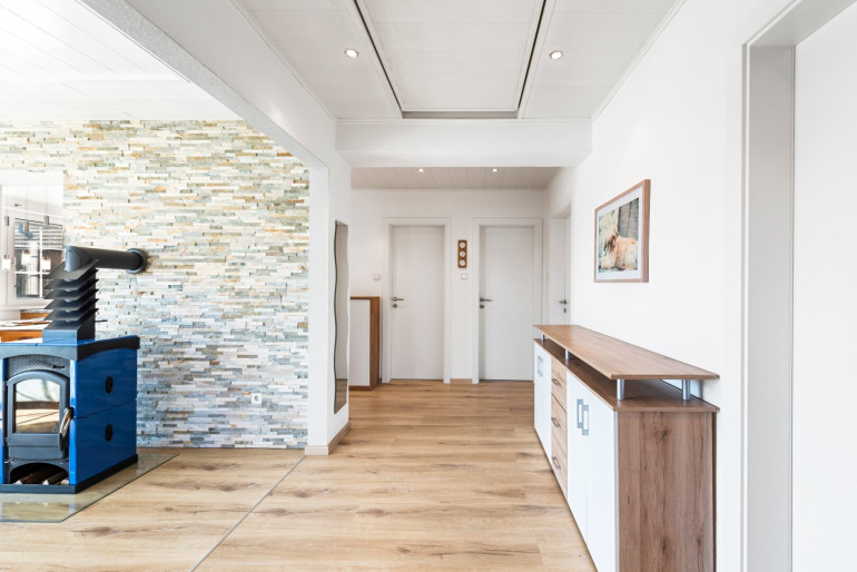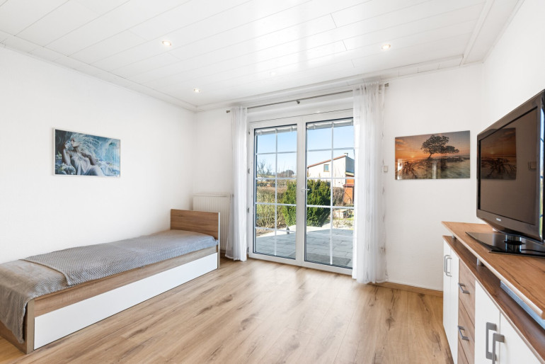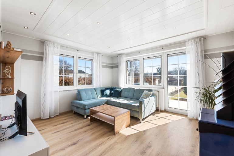 Vom Wohnbereich gelangen Sie auf die vordere Terrasse zum Vorgarten und über den zweiten Nebenraum auf die große gartenseitige Terrasse.