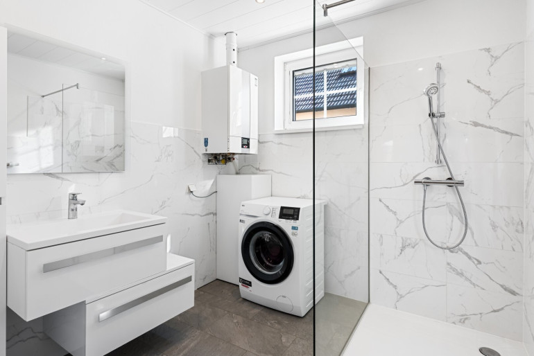 Im Vorgarten befindet sich ein Flüssiggastank, der mit dem Haus verbunden ist und sparsamen, effizienten Heizbetrieb ermöglicht. Im Winter sorgt der Schwedenofen für wohltuende Wärme und beheizt einen Großteil des Wohnraums.