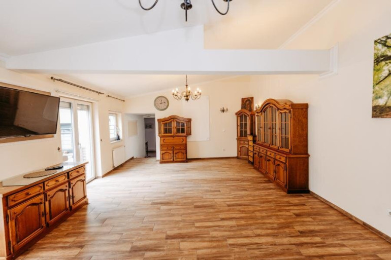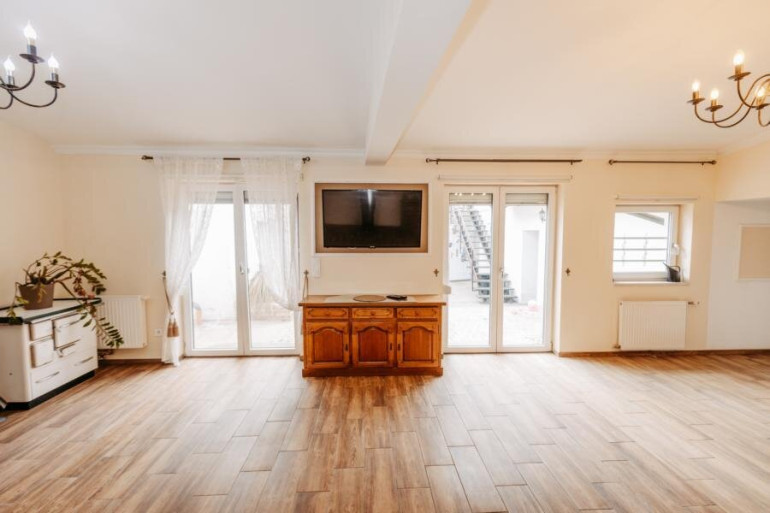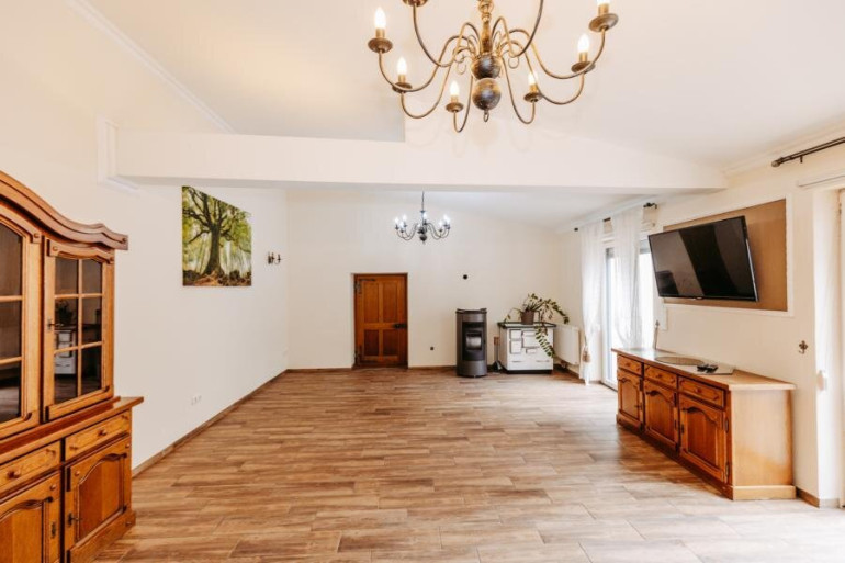 großer Wohnsalon mit Essbereich und Terrassenzugang, Garderobe.