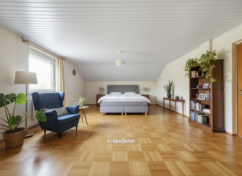 Über eine Treppe gelangt man vom Flur in das ausgebaute Dachgeschoss, auf dem sich ein ca. 54 m² großes Zimmer sowie zwei weitere kleinere Räume und darüber hinaus noch ausreichend Stauraum befinden. Das Dachgeschoss bietet durch seine Größe ideale Voraussetzungen für eine zeitgemäße Adaptierung und dem Einbau eines weiteren Badezimmers.
