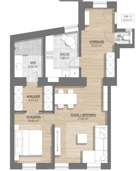 Diese perfekt geschnittene 2-Zimmer-Wohnung im 4.Stock überzeugt durch eine durchdachte Raumaufteilung. Die Wohnung bietet einen Essen-/Wohnbereich, ein Schlafzimmer sowie eine Ankleide. Ideal für Singles oder Paare.