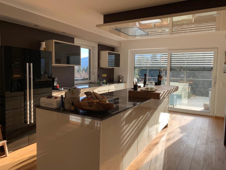Das Wohnhaus verfügt über einen wunderschönen Garten, der zum Entspannen und Genießen einlädt. Hier können Sie im Sommer gemütliche Grillabende mit Freunden und Familie verbringen oder einfach nur die Sonne auf dem Balkon oder der Terrasse genießen. Die ursprünglich 1965 entstandene Gebäudehülle ist 2014 praktisch völlig entkernt, die Raumaufteilung neugestaltet und durch eine Terrassen- und Balkonanlage, einen separat angebauten Stiegenaufgang sowie zwei Gaupen im ebenfalls neu aufgesetzten Dachgeschoss erweitert worden. Entstanden ist ein neuwertiges modernes Wohnhaus mit großzügigen lichtdurchfluteten Wohnräumen. Die offene Wohnküche mit Einbauküche ist der perfekte Ort, um gemeinsam mit Ihren Liebsten zu kochen und zu essen. Durch die großen südwestlich ausgerichteten Fensterfronten gelingt viel Licht in die Räume und es bietet sich ein herrlicher Ausblick auf die umliegende Bergwelt.