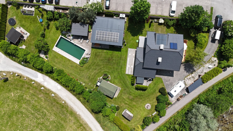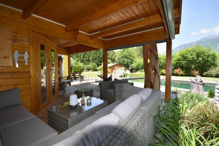 Der angelegte Garten ist ein echtes Highlight dieser Immobilie. Genießen Sie entspannte Stunden im Freien, während Sie von der Poolterrasse aus den Blick auf die majestätischen Berge der Umgebung schweifen lassen. Angeschlossen ist ein überdachter Sitzbereich mit Gartensauna. Die Terrasse vor dem Wohnhaus und der Balkon laden dazu ein, die frische Bergluft und die Ruhe der Natur in vollen Zügen zu genießen. Ob für gesellige Grillabende mit Freunden oder ruhige Momente der Entspannung – dieser Außenbereich wird schnell zu Ihrem Lieblingsplatz.