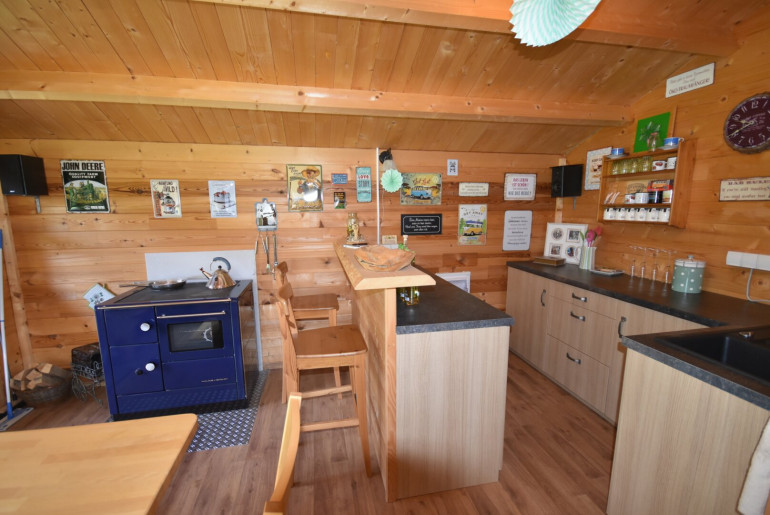 - Ausgebautes Gartenhaus mit Küchenzeile, Gesellschaftsraum, Holzofen und WC