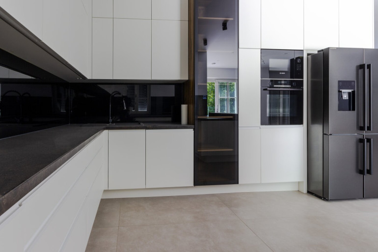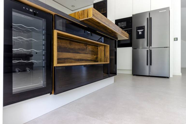 Betreten Sie durch den eleganten Eingangsbereich ein Zuhause, das modernste Architektur mit behaglicher Atmosphäre verbindet. Der loftartige Wohn-Küchenbereich im Erdgeschoss fasziniert mit hohen Decken, großzügigen Glasfronten und einem fließenden Grundriss, der gesellige Abende zum Erlebnis macht. Die hochwertige Einbauküche mit Premium-Geräten lädt zum Kochen und Genießen ein, so dass an Abenden für gemütliche Stimmung gesorgt ist.
