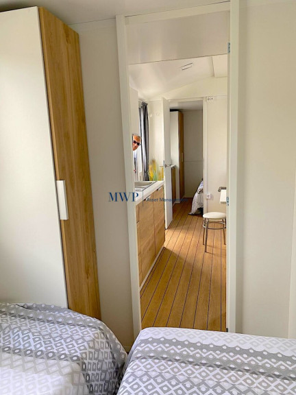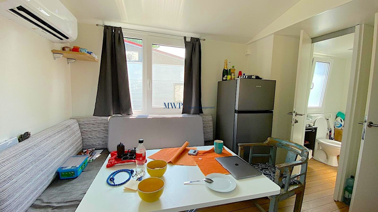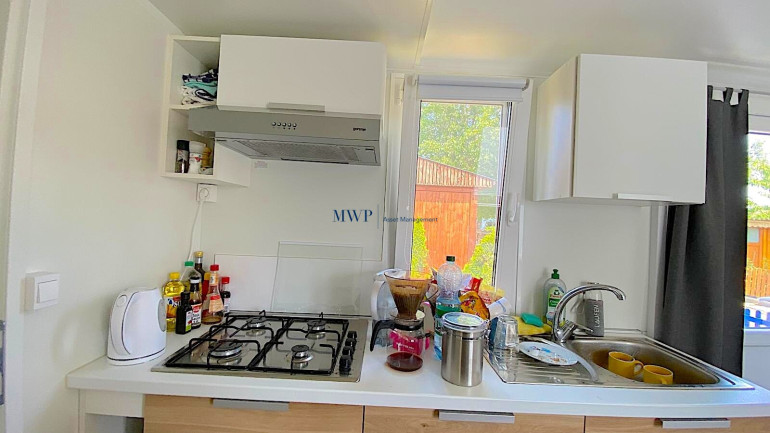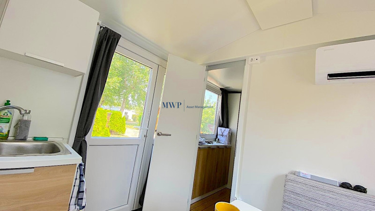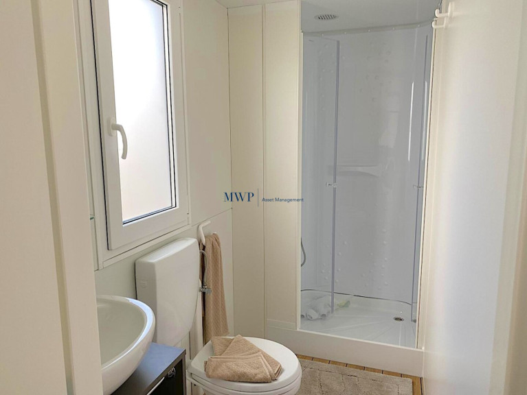 Das stilvolle, französische Holzmobilhaus überzeugt mit einer Wohnfläche von ca. 24 m² und einer durchdachten Raumaufteilung: Vorzimmer, gemütliches Wohnzimmer, Küche mit Essbereich sowie ein Schlafzimmer bieten alles, was man für entspannte Tage am See benötigt. Die Immobilie wird vollständig möbliert übergeben – inklusive Einbauküche, Holzschränken, Betten und einer eleganten Glasvitrine. Ein Badezimmer mit Dusche und WC ist ebenfalls vorhanden.