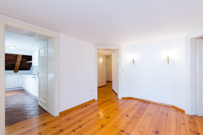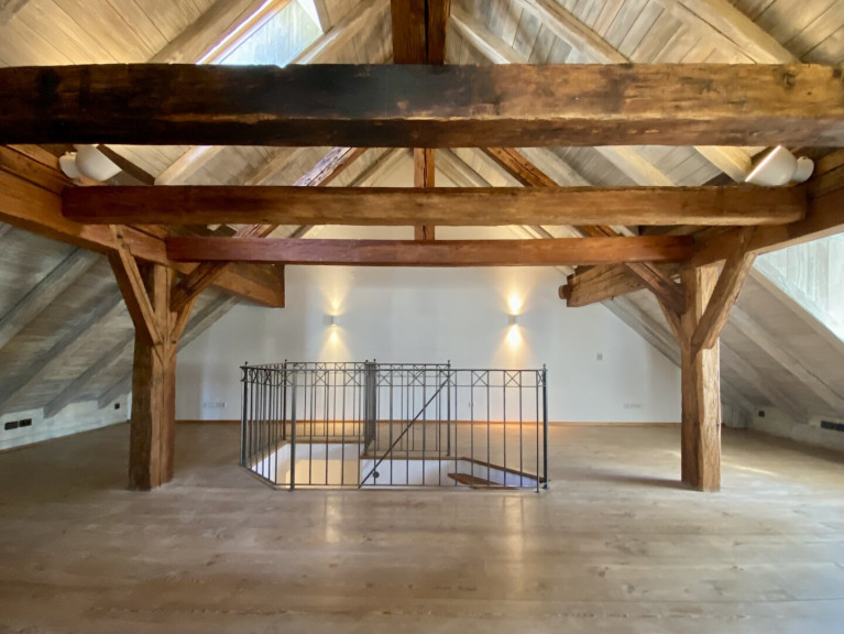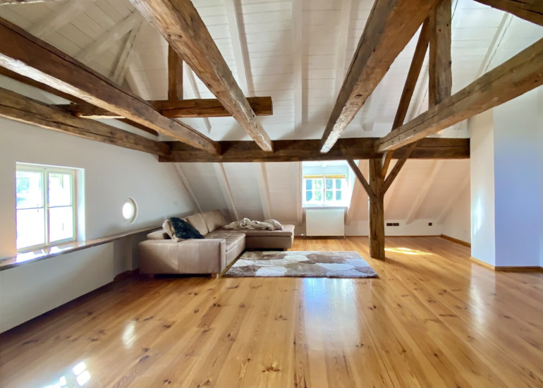 2005 von einem bekannten Kunstmäzen mit großem Aufwand und Feingefühl für die Substanz generalsaniert, wurde es in 3 charmante Wohnungen mit moderner Infrastruktur adaptiert. Die gegenständliche Maisonette-Wohnung mit Eingang im ersten Stock erstreckt sich über 2 Ebenen, Küche und Bad sind vollständig ausgestattet. Neben dem großen atelierartigen Wohnzimmer auf der Dachgeschossebene verfügt die Wohnung über ein großes Schlafzimmer mit großem Badezimmer mit WC sowie ein kleineres Schlaf- od. Gästezimmer mit eigenem Duschbad/ WC, das sich auch als Home-Office eignet.