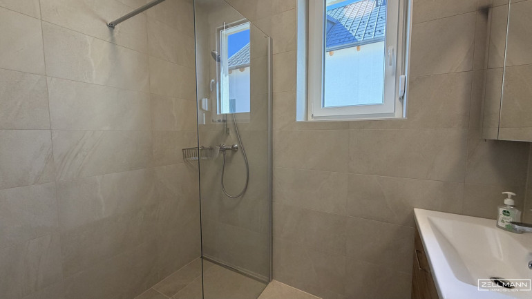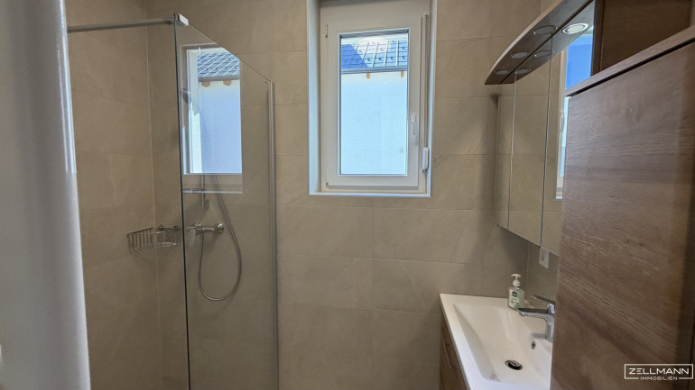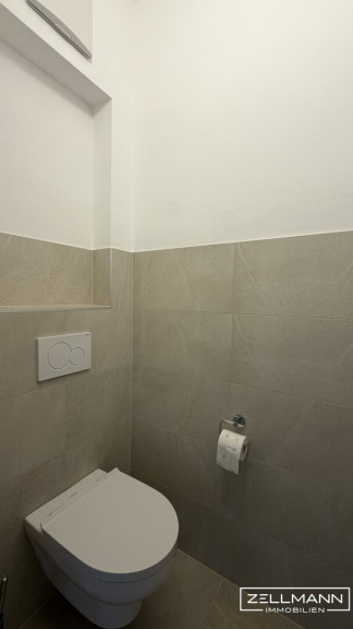 Großformatige Fliesen, eine elegante Walk-In-Dusche sowie hochwertige Armaturen schaffen ein stilvolles Ambiente. Das separate WC wurde ebenso neu ausgeführt und fügt sich harmonisch in das Gesamtbild ein.
