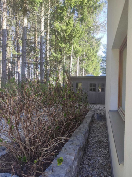 Der Garten ist nahezu uneinsichtig und wird durch den großen Pool dominiert, aber auch Blumen und Gemüse finden genügend Platz. Der Pool ist von einer großzügigen Terrasse eingerahmt und hat natürlich auch eine Außendusche.